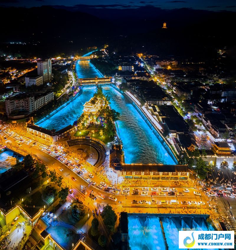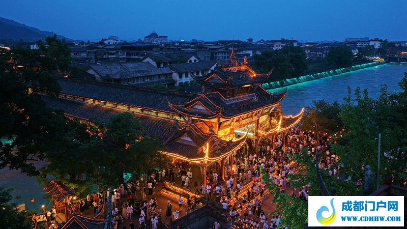 夜幕下,成都都江堰南桥周围熙熙攘攘。