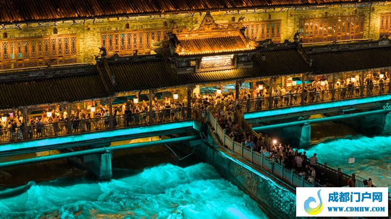 夜幕降临,成都都江堰南桥的晚风里藏着温柔。青蓝色霓虹灯光给岷江披上薄纱,缥缈轻柔,十分梦幻。南桥之上,雕梁画栋映着灯火,行人脚下是奔流的历史,身边是自在闲适烟火气——古与今在此相拥,连晚风都带着甜。每晚24点前,都可以来打卡哦!
